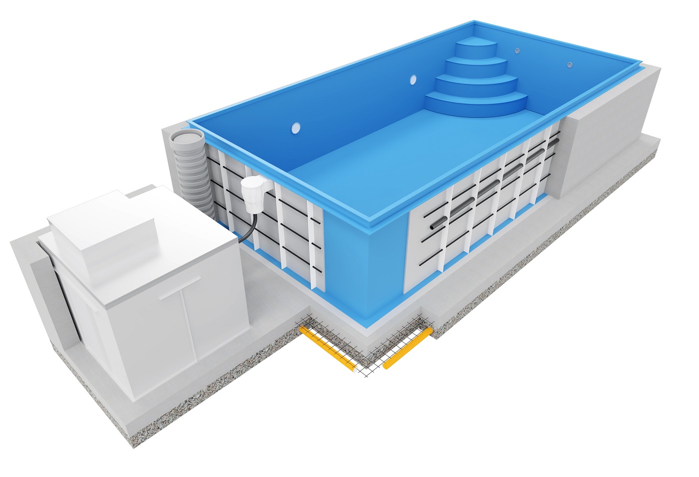 Optioneel kan een volledige technische installatie worden meegeleverd zoals zandfilter, pomp, dosering, desinfectie en besturing.