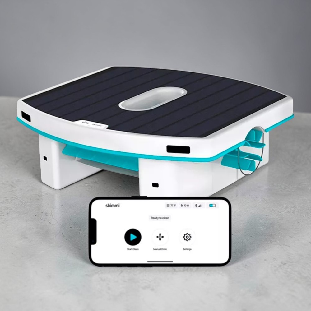 Het Skimmi oppervlaktemodel is uitgerust met een oplaadstation op zonne-energie zodat we geen energie hoeven te verspillen aan schoonmaken. Het is een ideale keuze omdat het het gemak van een slimme schoonmaakrobot, die in staat is om ruimtes te scannen en efficiënt schoon te maken, combineert met het gemak van het vermijden van elektriciteitsverbruik en het verlagen van de maandelijkse kosten van het bezitten van een zwembad.